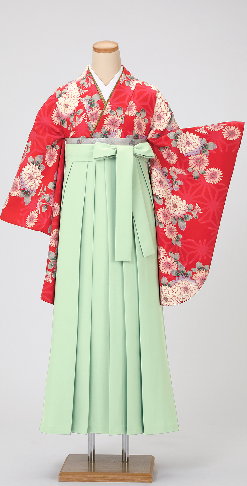 緑系の袴は暖色系・寒色系の中間に位置する中性色にあたる色なので、基本的に暖色・寒色ともに合わせやすいです。